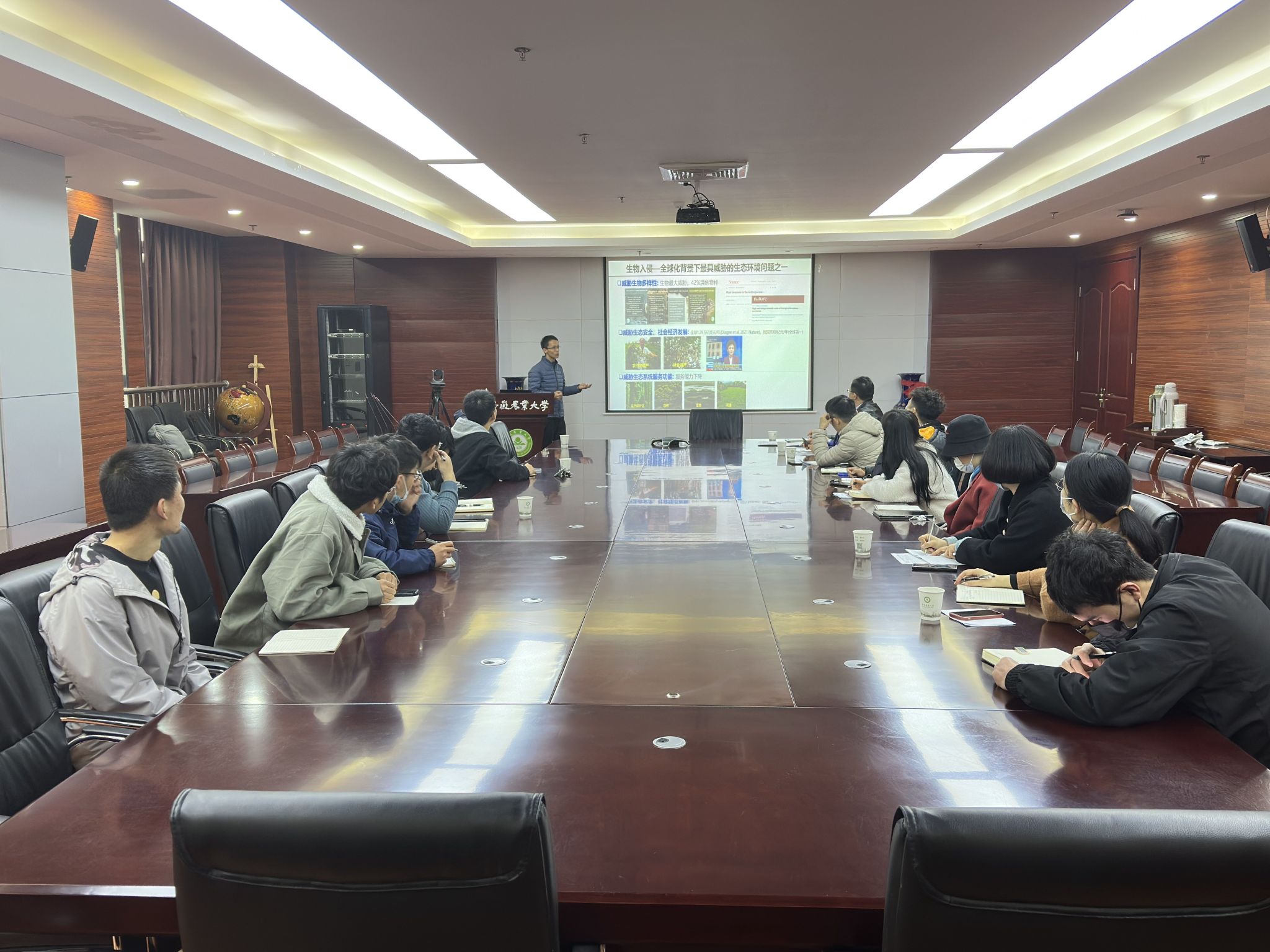 本网讯 3月21日下午,资源与环境学院于中西部综合楼510会议室举办“入侵生物”专题学术交流,会议特邀华中农业大学王永健教授作题为“非生物-生物胁迫下植物功能性状对入侵成功的贡献”学术报告。学院40余名师生参加了报告会,会议由学院副院长张震教授主持。