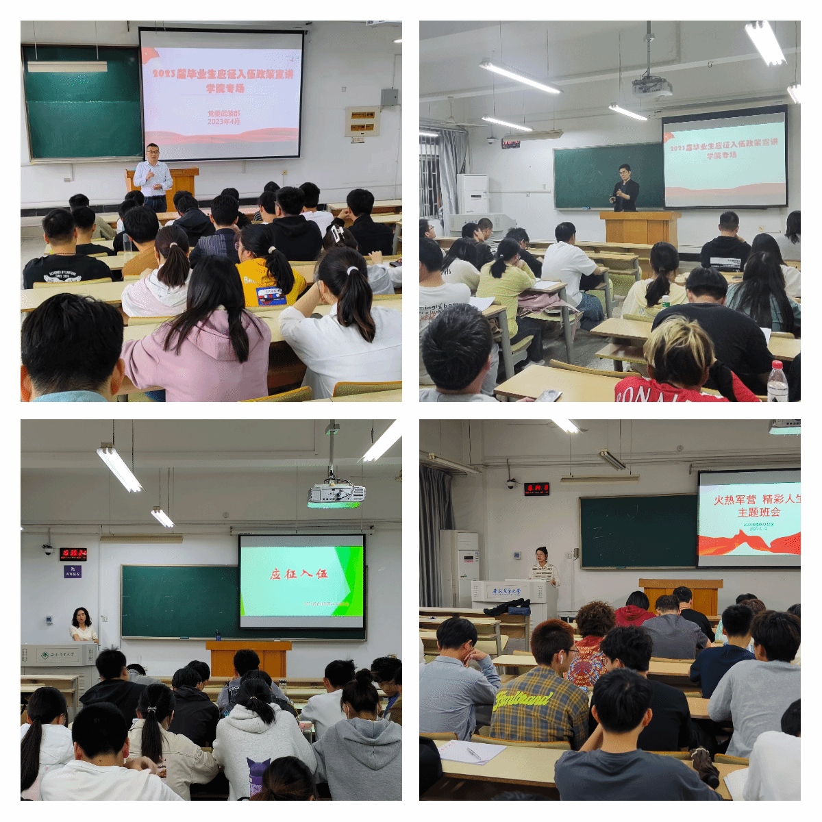 为实现宣传动员全覆盖,各班级召开“火热军营 精彩人生”主题班会,由辅导员主讲国防教育和征兵政策宣讲课,以集中宣讲的方式,为学生细致讲解了关于参军入伍的一系列政策,使学生知晓参军入伍的意义、参军入伍流程、参军入伍的优惠政策,帮助学生算好政治帐、经济帐和前途帐,巩固学生坚定投身国防的信念。