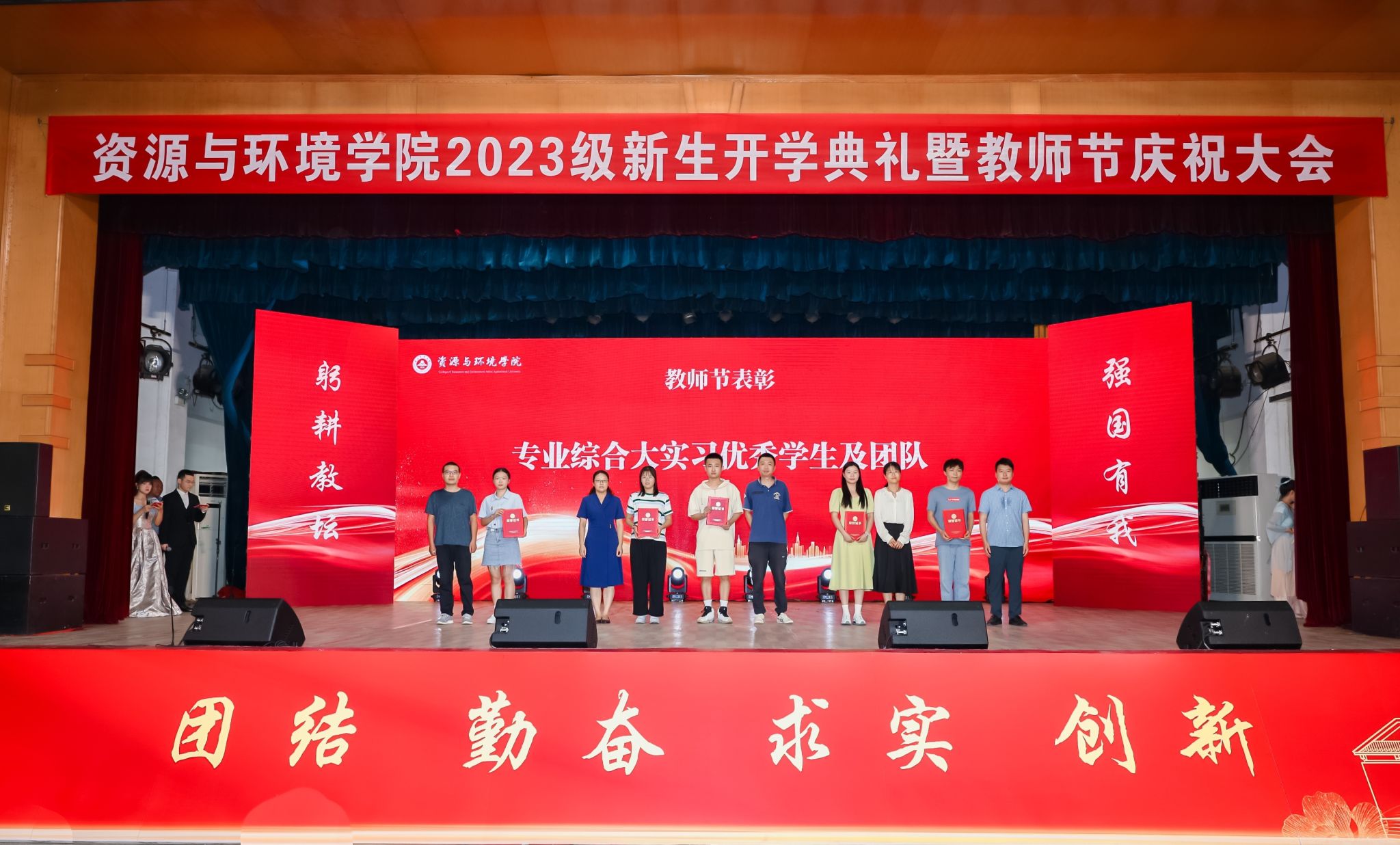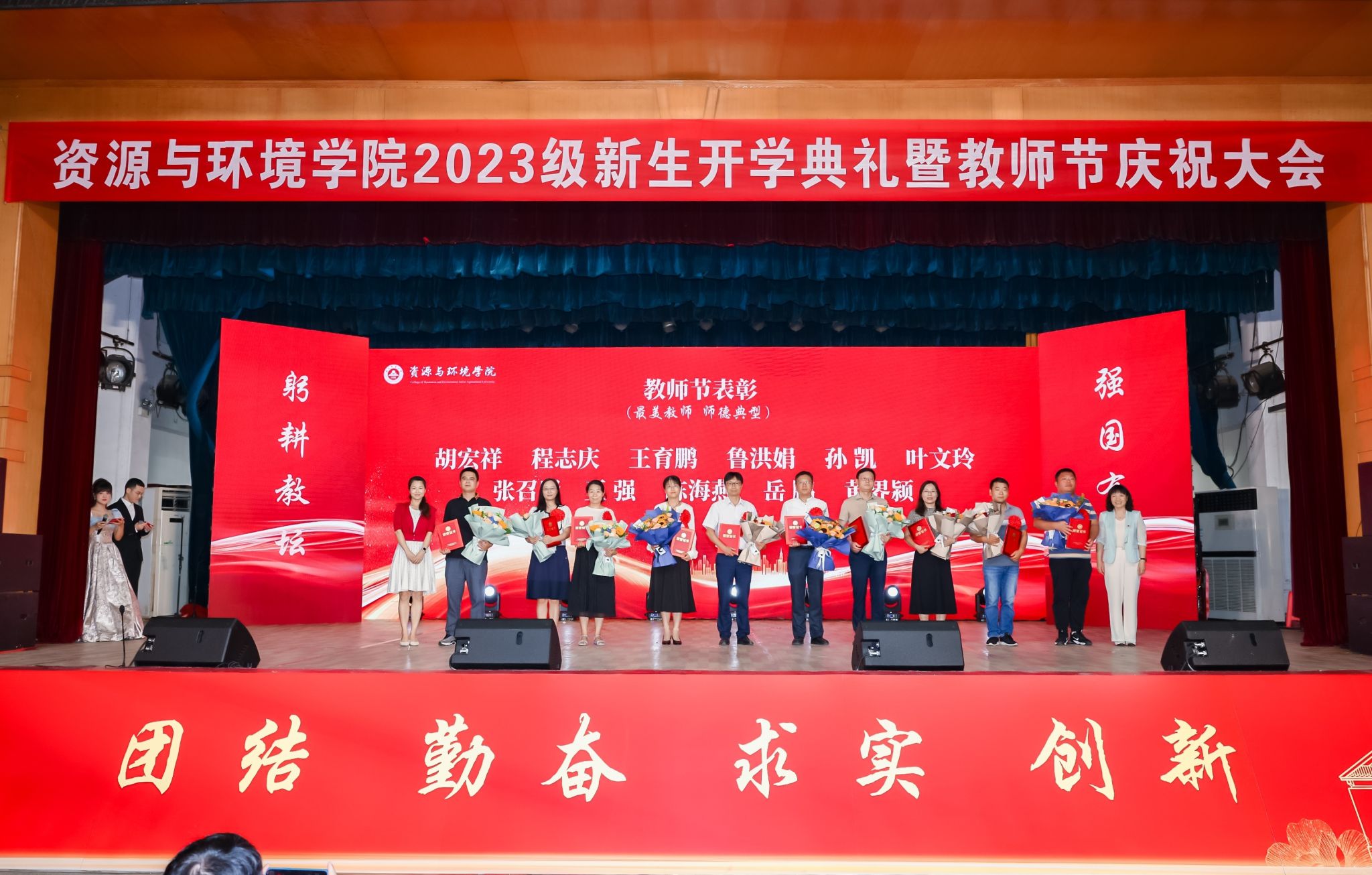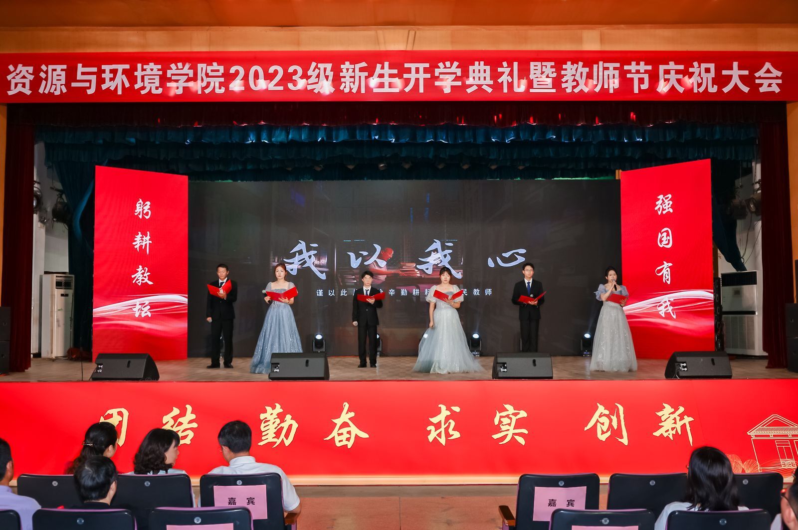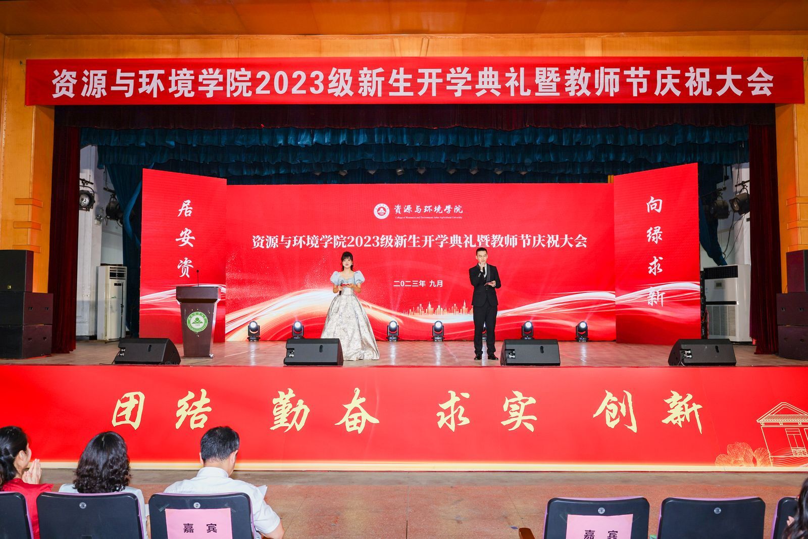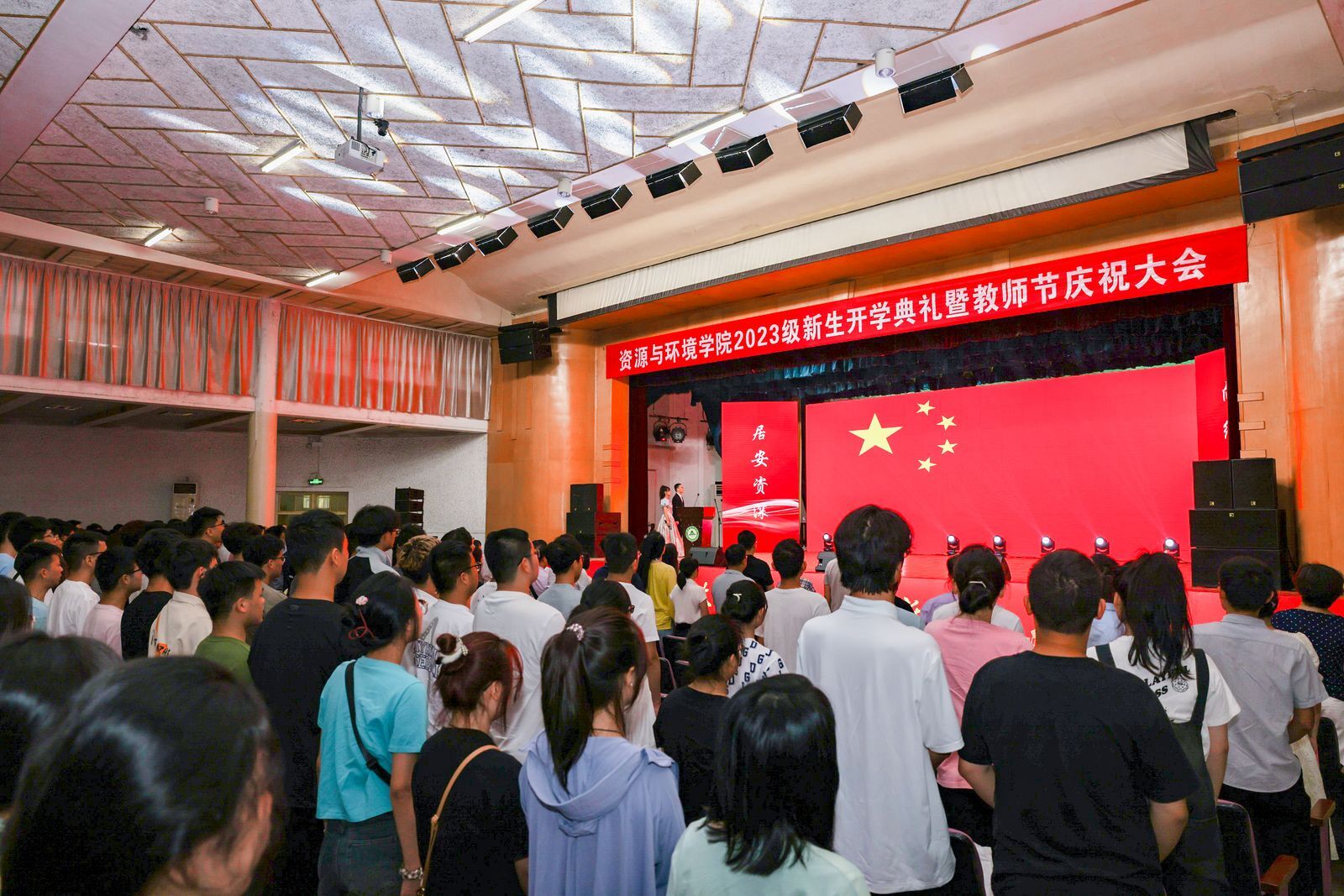 本网讯 在第39个教师节来临之际,9月9日上午,资源与环境学院2023级600余名新生开学典礼暨教师节庆祝表彰大会在校大礼堂隆重举行。党委学生工作部、党委武装部、学生处(大学生就业指导中心)部长、处长、主任任琪应邀出席,学院党政领导班子全体成员、各系部负责人、师生代表、专兼职辅导员、研究生班主任以及全体2023级新生共同参加典礼。