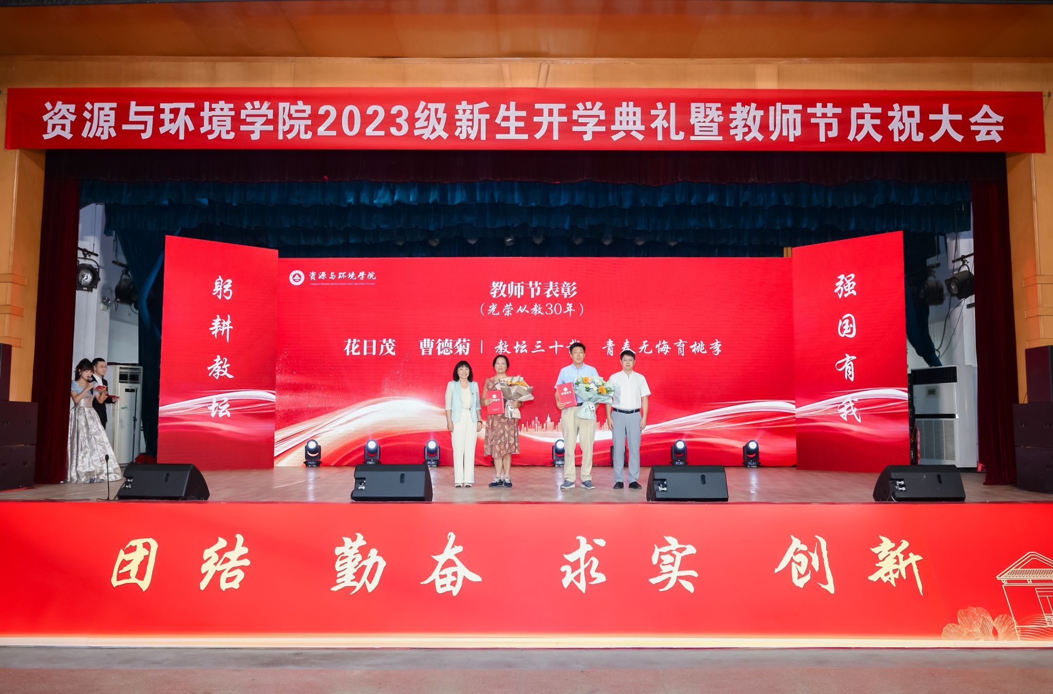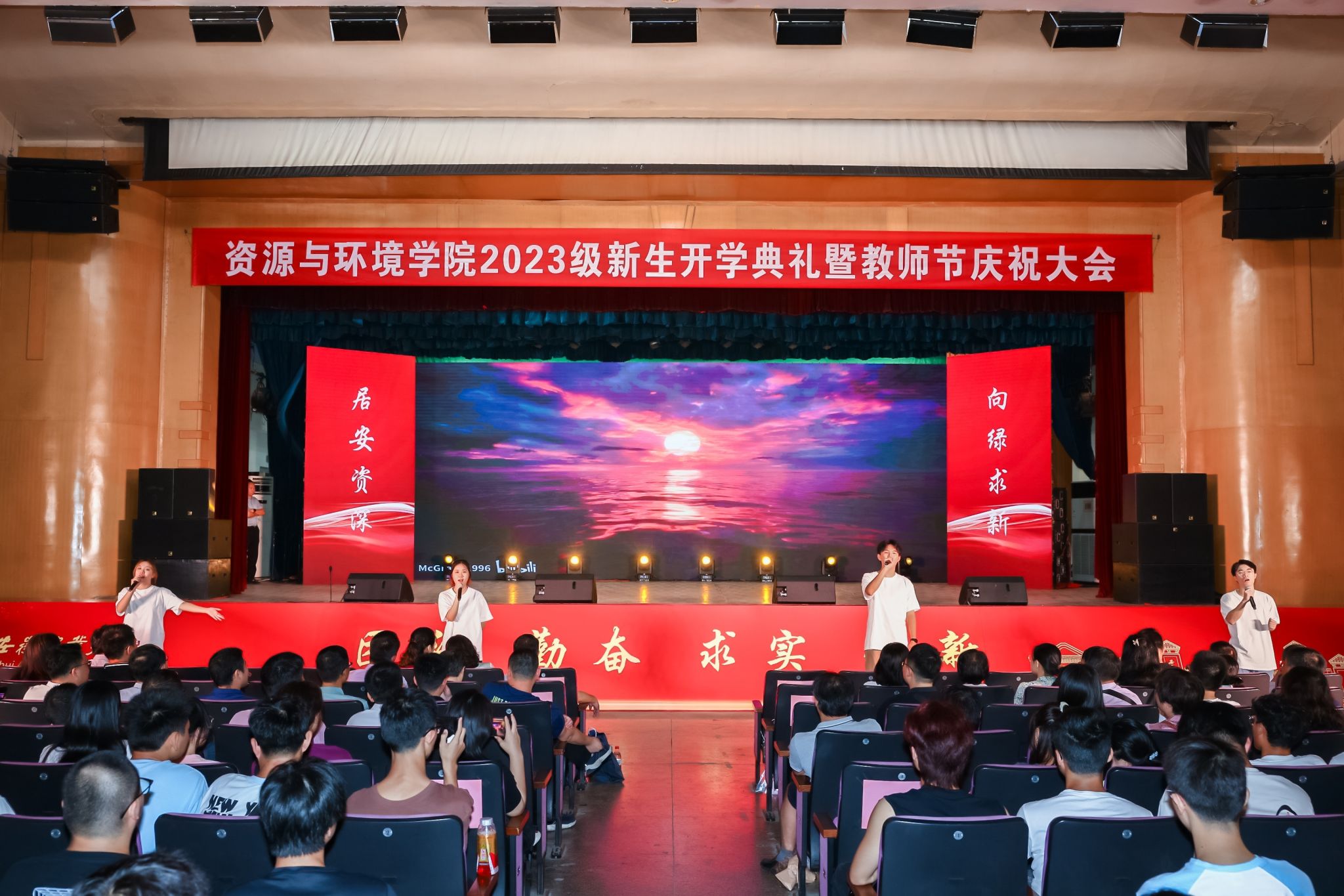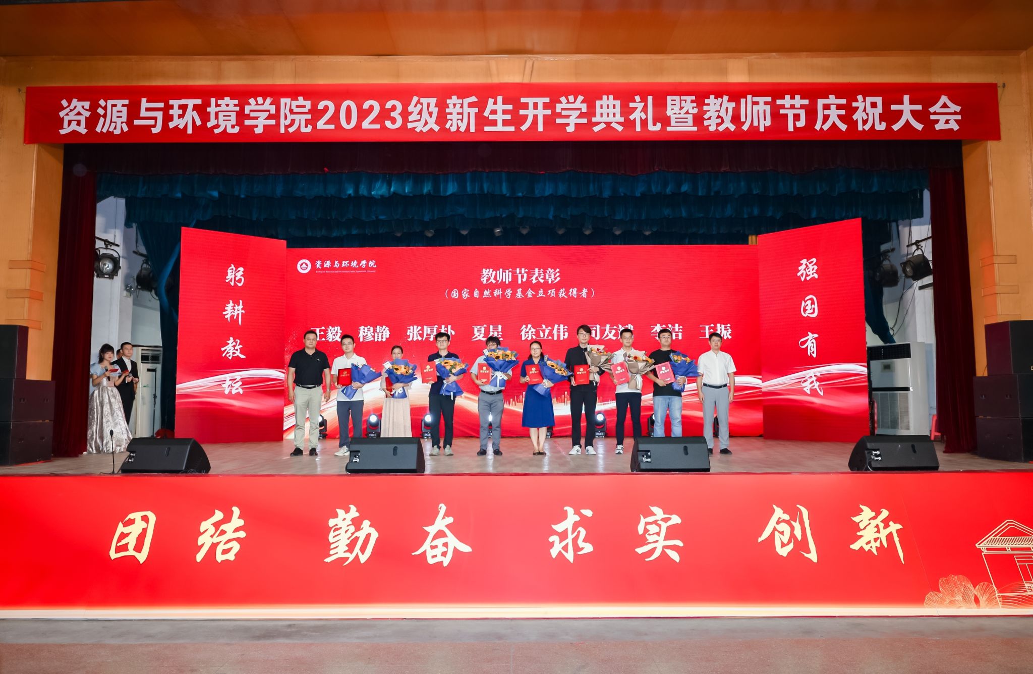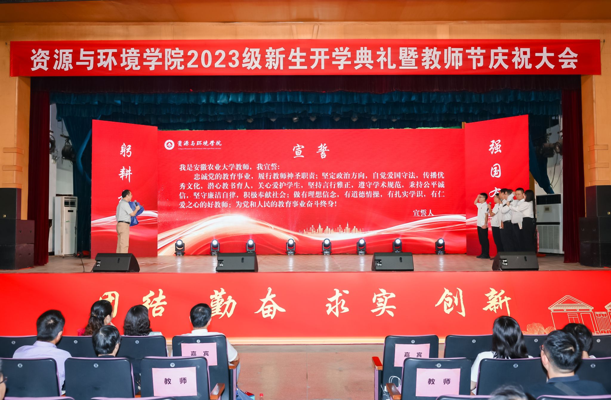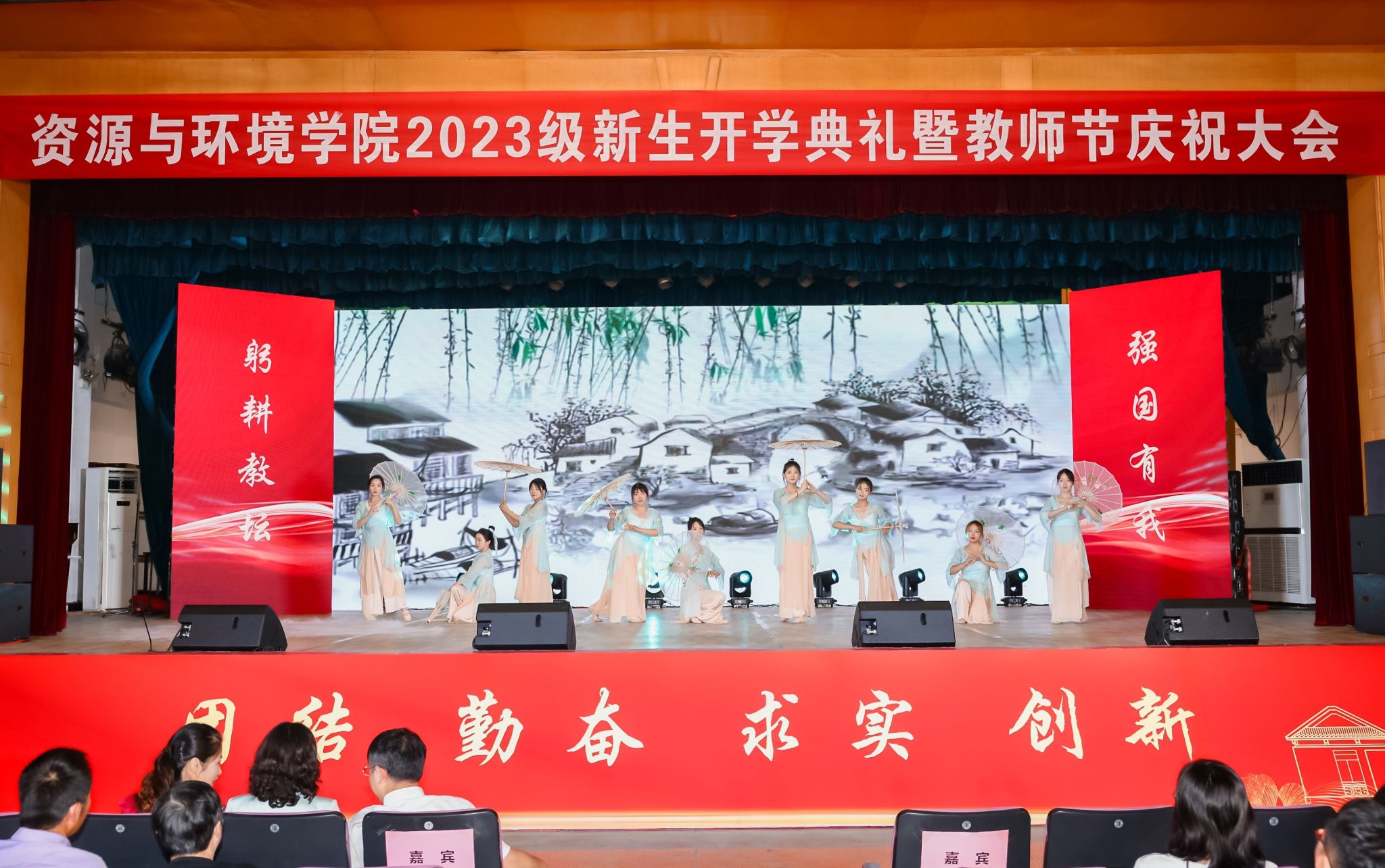 本网讯 在第39个教师节来临之际,9月9日上午,资源与环境学院2023级600余名新生开学典礼暨教师节庆祝表彰大会在校大礼堂隆重举行。党委学生工作部、党委武装部、学生处(大学生就业指导中心)部长、处长、主任任琪应邀出席,学院党政领导班子全体成员、各系部负责人、师生代表、专兼职辅导员、研究生班主任以及全体2023级新生共同参加典礼。