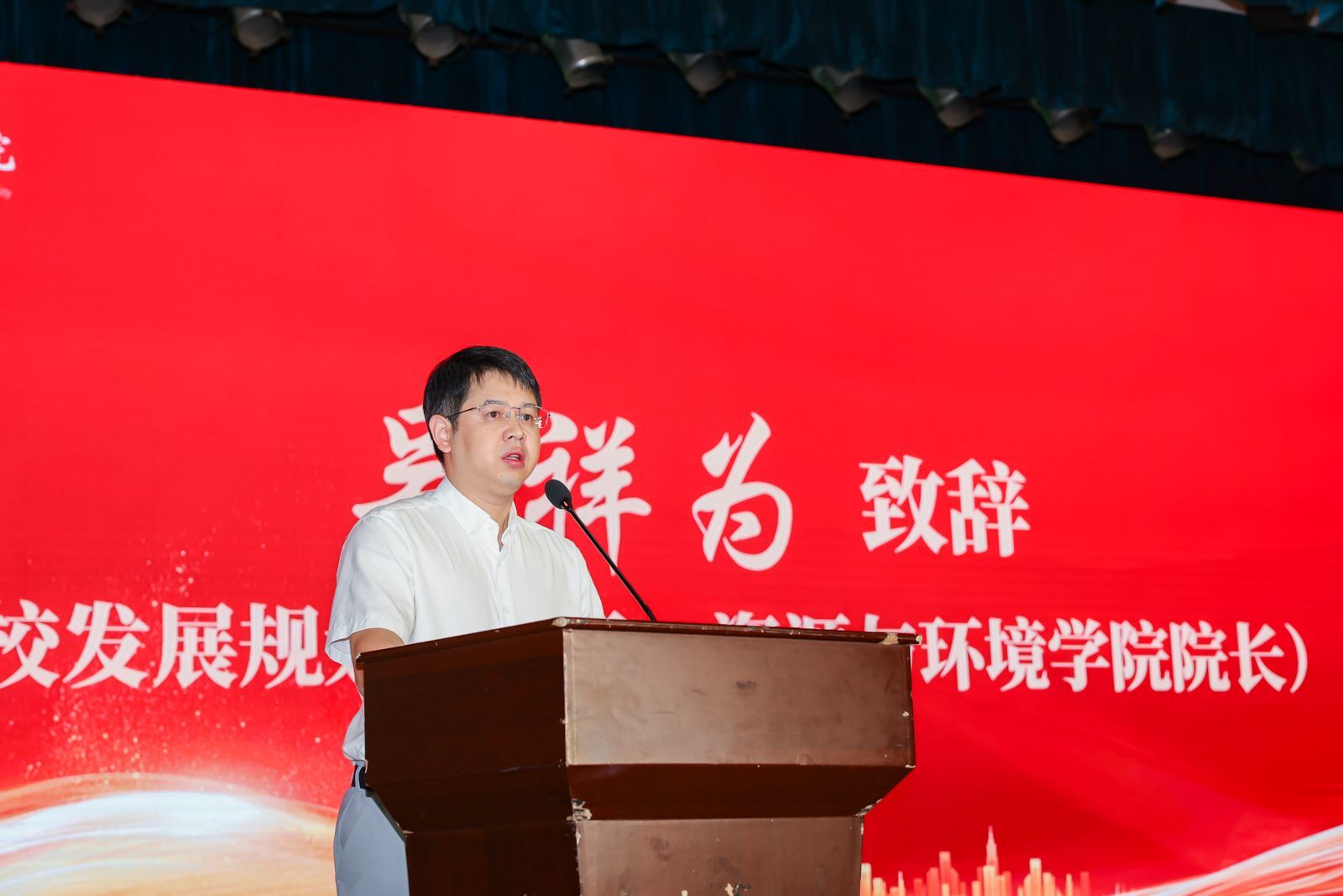 校发展规划处处长、资源与环境学院院长吴祥为致辞。他以《做胸怀远大抱负,勇于拼搏奋斗的出彩资环人》为题,从师资力量、学科专业和人才培养等方面介绍了学院的基本情况,着重介绍了学院近年来在人才培养、学科建设、科学研究、社会服务等方面取得的丰硕成果并以学长身份勉励新生:要生逢其时当奋斗,肩负起时代赋予青年的使命,用奋斗书写青春,努力在世界可持续发展舞台上发出中国青年的声音,描绘自己最美的样子;要造炬成阳涵品格,放眼长远,久久为功,以“咬定青山不放松”的执着和“板凳甘坐十年冷”的恒心,在学习的道路上不断求索,厚积薄发,矢志一步一步取得进步和成绩;要不懈探索尽历练,遇到问题或挫折,能够静下心来,接纳自我,既不钻牛角尖,也不放弃,坚持不懈探索,磨练出更坚定的意志,找到适合自己的路。