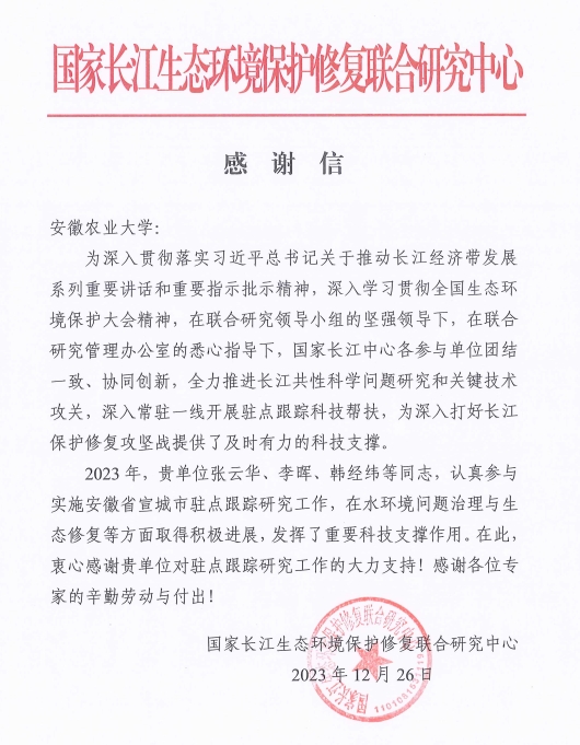 本网讯 近日,安徽农业大学收到国家长江生态环境部修复联合研究中心的感谢信,信中对我校资源与环境学院张云华、李晖、韩经纬等师生的辛勤付出和对安徽宣城驻点工作的大力支持表达了感谢。