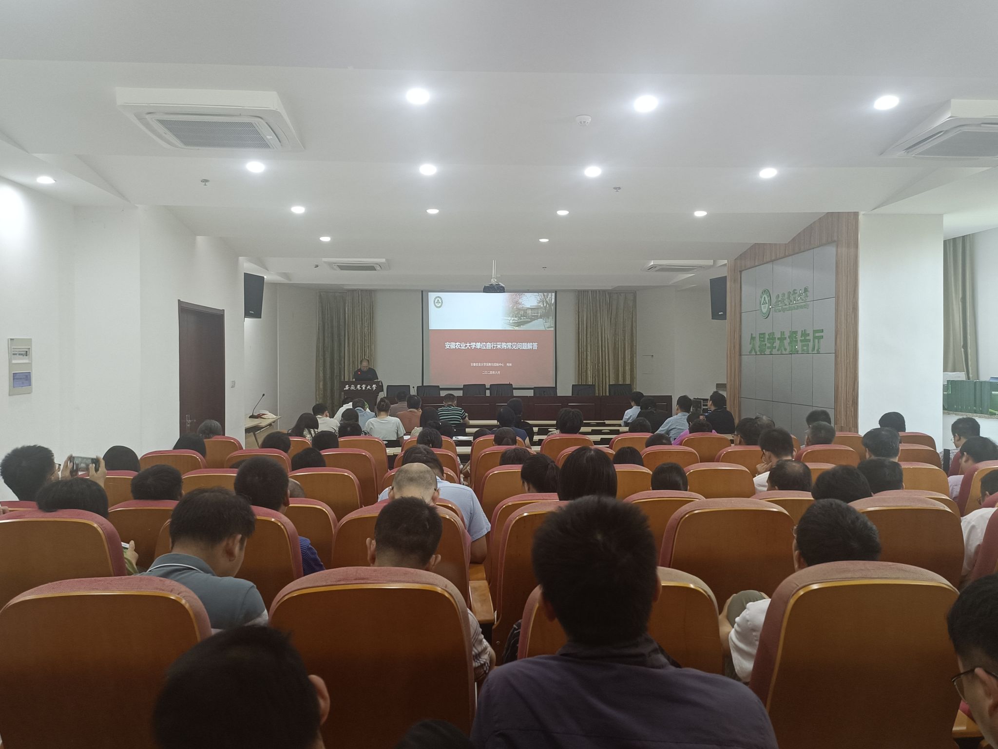 本网讯 6月12日下午,资源与环境学院在中西部综合楼久易报告厅举行采购工作培训会。学校采购与招标中心业务骨干梅林老师应邀来院交流并作题为“安徽农业大学单位自行采购常见问题解答”培训会,会议由学院党委副书记姚洪章主持,全体专任教师参加学习。