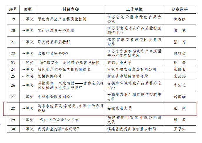 本网讯 近日,由农业农村部农产品质量安全监管司举办的“传播科学知识 共享安全优质”首届全国农产品质量安全科普大赛结果揭晓,我校资源与环境学院王毅教授报送的原创科普视频作品《淘米水能否洗掉蔬菜、水果中的农药残留》经综合专家评分、线上展播效果以及现场展示等评审环节,从众多参赛作品中脱颖而出,荣获一等奖。