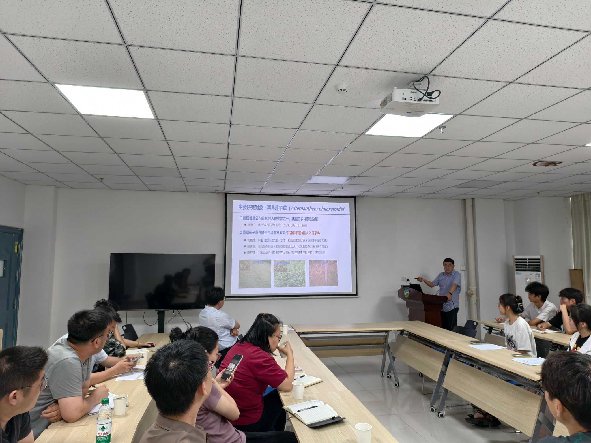 卢新民教授以《外来植物入侵机制和防控策略研究——以喜旱莲子草为例》为题作报告,系统阐述了入侵植物喜旱莲子草沿纬度梯度变化的关键机制,论证了“地上地下生物协同促进物种入侵”新假说的可行性,明确了本土植物多样性在遏制该物种爆发中的潜力与作用机制,并提出“地域差异性”防控策略,为入侵植物防控技术的研发奠定了重要理论基础。会后,卢教授与我院植物生态学团队进行了交流与研讨。