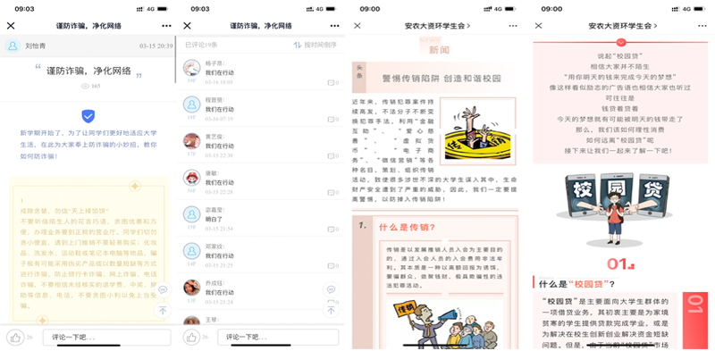 本次班会由辅导员、班主任主持,通过观看视频与现场交流,主要强调了网络电信诈骗形式及预防措施。介绍了常见的骗术:刷单诈骗、网购诈骗、杀猪盘交友诈骗、手机短信诈骗、冒充公检法诈骗、利用其掌握的个人信息实施诈骗等。提醒同学们平时生活中提高防范意识,如果遇到诈骗情况,要及时向辅导员、班主任和学校保卫处反映,并及时报警,尽可能保留作案人留下的相关证据,积极配合调查破案。同时,学院利用易班、微信公众号等新媒体平台进行线上广泛宣传,形成融媒体矩阵效应。