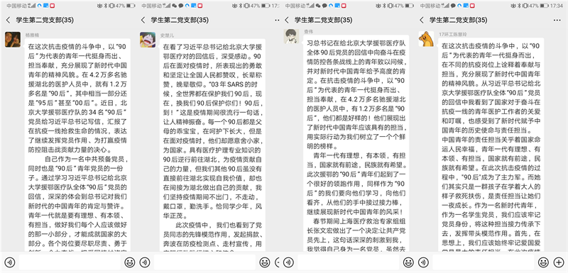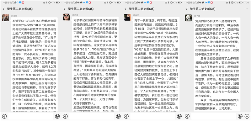 本网讯 3月15日,习近平总书记给北京大学援鄂医疗队“90后”党员回信在广大青年中引发热议,近日,资源与环境学院学生第二党支部通过微信群学习习近平总书记重要回信精神,交流学习心得。广大学生党员纷纷表示,作为“90”“95”后学生党员,要牢记总书记的嘱托,继续在学习实践中坚定理想信念,练就过硬本领,珍惜韶华、不负青春,为中国特色社会主义事业贡献青春力量。