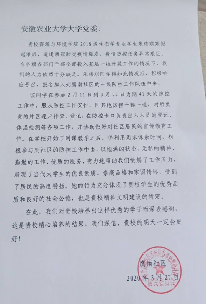 本网讯 3月27日,资源与环境学院收到淮北市相山区街道办事处鹰南社区的表扬信,对学院2018级生态学专业朱玮琪同学参与社区街道疫情防疫志愿服务工作给予表扬。