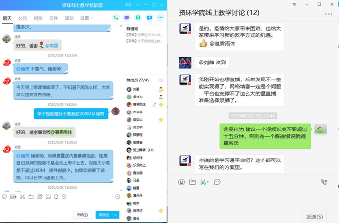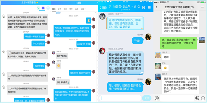 本学期由学院教师开设的理论课共53门次,涉及到全院2017、2018、2019级每个专业,部分课程为全校大农类学生开设的基础课,受众面大,影响范围广。学院第一时间成立以党委书记李春保和副院长吴祥为为组长的教学工作领导小组,建立“学院—教研室、实验中心或学科学位点—教师”线上教学的三级联动机制,并在2月16日制定了《资源与环境学院关于做好疫情防控期间2019-2020学年春季线上教学工作的实施方案》《资源与环境学院关于做好疫情防控期间2020届本科毕业论文(设计)工作的实施方案》,依托超星泛雅平台与学习通、雨课堂、腾讯课堂、钉钉直播等教学平台,以QQ群、微信群答疑为辅助教学手段,确保教学顺利进行。