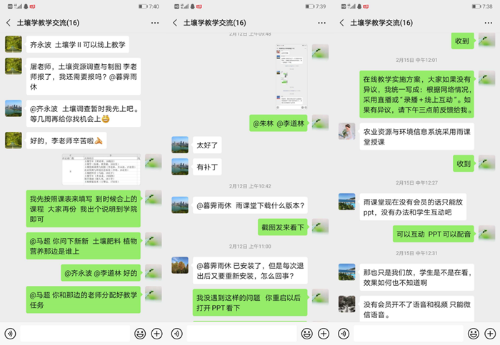 保障平台服务,提高线上教学能力水平。学院教工第一党支部书记兼土壤教研室主任屠人凤等先行一步研究线上平台操作方法和使用技巧,对即将开展线上教学的教师进行超星泛雅、雨课堂等平台的线上培训。同时建立线上教学工作交流群,及时沟通平台使用遇到的问题,交流经验、取长补短;教研室要求教师结合各平台优势并规避缺陷,跨平台准备线上教学任务,确保线上教学秩序规范、有序。