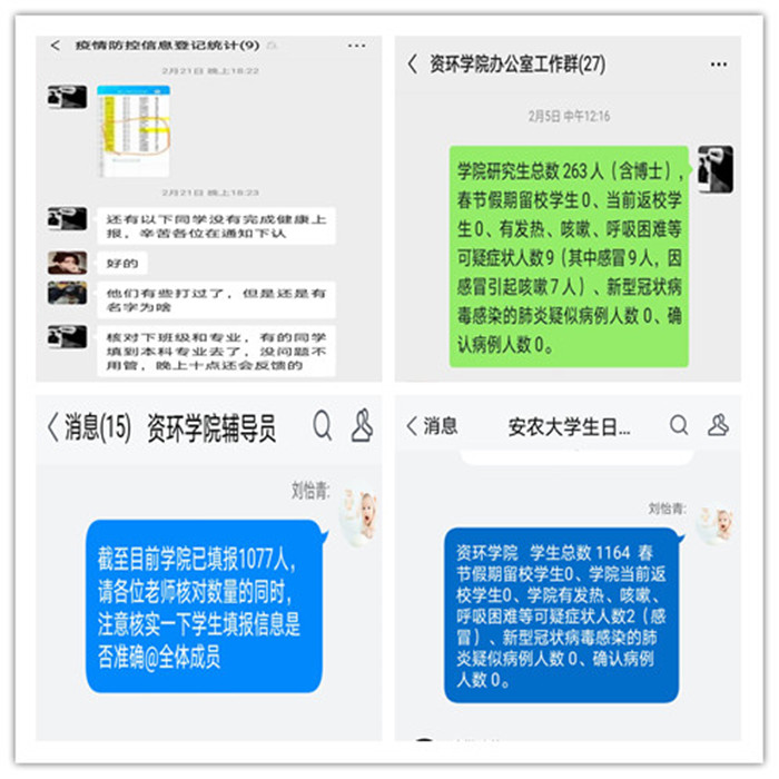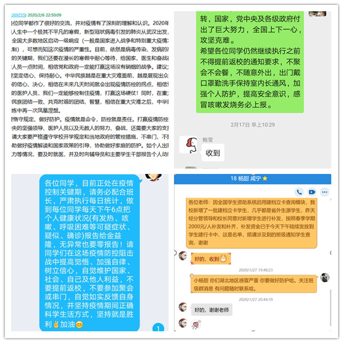 强化责任,严格网格化管理。疫情防控工作开始以来,学院本科生、研究生全体专兼职辅导员队伍坚持7*24随时待命,精准掌握学院1164名本科生、248名硕士研究生、12名博士研究生的每日健康状况和行踪,对15名湖北籍地区学生、28名有湖北地区经停和人员接触的学生进行重点摸排,建立1424份健康档案。研究生辅导员宫志锋、本科生辅导员刘怡青坚持每天线上时时关注,汇总统计全院研究生、本科生健康信息,严格落实“日报告,零报告”制度,做到疫情防控“全覆盖、无死角、不漏一人”。