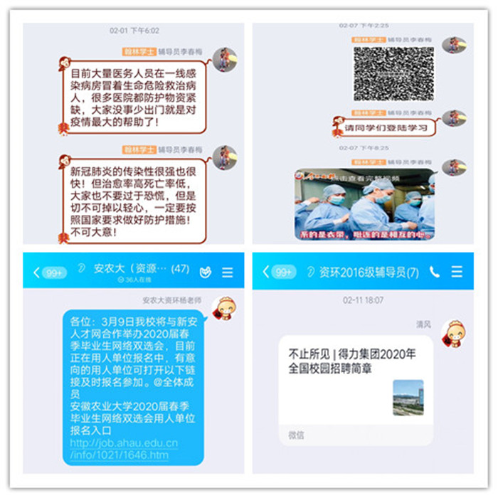 统筹兼顾,上好“开学第一课”。在抗击疫情的同时,学院坚持以人为本,全面了解学生在学业、就业、心理等方面的存在的困难,及时解决实际问题。辅导员队伍认真通知引导全体学生收看学校《2020春季学期“开学第一课”》,积极配合任课教师组织好线上教学,及时掌握学生网上学习情况,确保“延期不延教”取得实效。研究生辅导员主动协调导师与研究生保持密切联系,并帮助研究生利用线上资源查找文献。心理联络员李春梅开通了抗击疫情期间心理健康指导线上咨询服务,组织指导学院心理委员开展心理志愿服务线上值班工作,指导协助各专业辅导员做好抗击疫情期间班级同学的心理健康工作。就业联络员杨利梅起草了《安徽农业大学资源与环境学院致用人单位的一封信》,积极与用人单位取得联系,利用微信群、QQ群及时传达就业信息,协助企业开展线上招聘;认真统计学生考研初试情况,指导学生复试和制作简历,帮助学生树立信心。