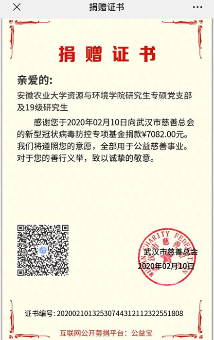 在武汉亟需全国驰援的时刻,资源与环境学院研究生专硕党支部立即行动起来,在支部党员中首先发起为武汉捐款奉献爱心的号召,形成了人人关注、人人参与的良好的氛围;同时,支部积极拓展活动参与面,号召资环学院全体研究生向武汉疫区捐款,共筹集人民币7082元,所有善款全部捐献给武汉市慈善总会的新型冠状病毒防控专项基金。