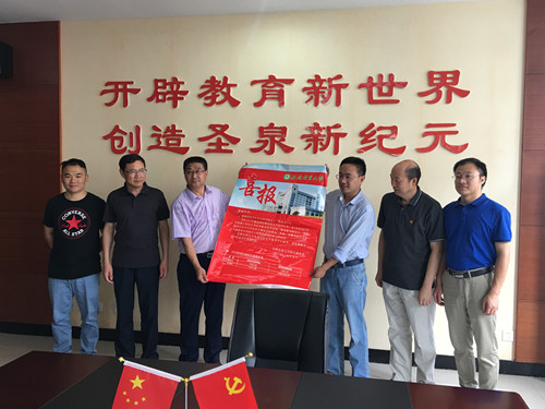 本网讯 为更好地宣传学校,吸引更多优质生源报考我校,6月26日下午,资源与环境学院党委书记李春保、党委副书记兼副院长张晓伟一行5人赴学校优质生源基地肥东圣泉中学开展招生宣传工作并送去考研喜报。