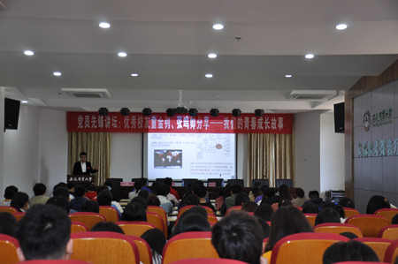 本网讯 为创新大学生思想政治教育形式和内容,帮助学生做好职业生涯规划,4月17日下午,资源与环境学院优秀校友“党员先锋讲坛”2019年第1期邀请中国科学技术大学硕士研究生、我校2018届环境科学专业毕业生童金钊,环境工程专业张鸣帅两位同学担任主讲嘉宾,为全院学生党员、入党积极分子和部分学生近150人分享他们的学习、成长历程。报告会由学生第二党支部书记程玉峰主持。