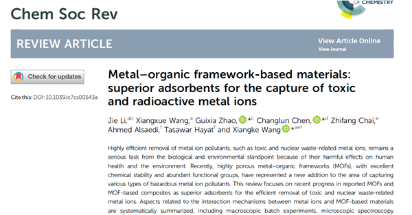 该文章阐述了金属-有机骨架(metal-organic frameworks, MOFs)材料用于重金属离子和放射性核素的研究进展、目前存在的问题以及对未来发展前景的展望等。作者首先提到了近些年来提高MOFs吸附性能的策略,总结了现有MOFs吸附核素机制的分析方法与技术,具体列举了将MOFs与改性的MOFs应用于放射性核素(铀酰、钍、钴、锶、铯、锝、铼等)以及常见的水中重金属离子(铬、砷、汞、硒、铅等)的治理研究,并与传统的吸附剂以及先进的纳米材料进行对比,突出了MOFs材料在环境治理中的重要价值。最后,文章总结了MOFs材料依然存在的挑战以及尚未解决的问题,如MOFs在不同pH条件下的结构稳定性还有待提高、水稳定性还需进一步解决、反应速率慢、成本略高等。MOFs材料用于废水治理的应用前景光明,相信在未来研究者会有针对性地合成MOFs,使MOFs真正应用于实际环境的治理。该论文刊发至今,已被引用187次。