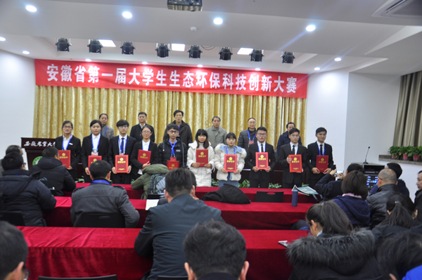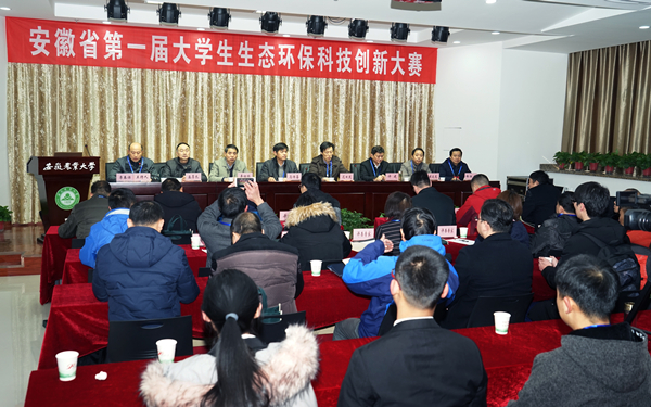 本网讯 12月28日,由安徽省普通本科高校环境类专业合作委员会主办,我校资源与环境学院承办的安徽省第一届大学生生态环保科技创新大赛决赛在我校成功举行。本次大赛以“践行绿色发展理念,服务乡村振兴战略”为主题,旨在贯彻落实全国教育大会精神,提高本科教育教学质量,营造大学生勇于创新、善于创业的良好氛围。副校长马传喜出席开幕式并致辞,全省普通本科高校环境类专业合作委员会主任、我校科技处处长花日茂、教务处长李绍稳,安徽省生态环境厅绿色办主任许建,以及专合委专家代表、行业主管部门和企业代表、资环学院党政领导等参加了开幕式。