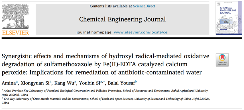 本网讯 近日,我院环境工程学科司友斌团队在国际高水平期刊Chemical Engineering Journal (中科院1区,影响因子IF 6.735)发表论文:“Synergistic effects and mechanisms of hydroxyl radical-mediated oxidative degradation of sulfamethoxazole by Fe(II)-EDTA catalyzed calcium peroxide: Implications for remediation of antibiotic-contaminated water”(https://doi.org/10.1016/j.cej.2018.07.078)。团队主要研究方向之一是磺胺类抗生素的降解,该论文研究内容是司友斌教授主持的国家自然科学基金项目。该文第一作者为生态学2016级博士Amina,司友斌教授为通讯作者,安徽农业大学为论文的第一及通讯单位。