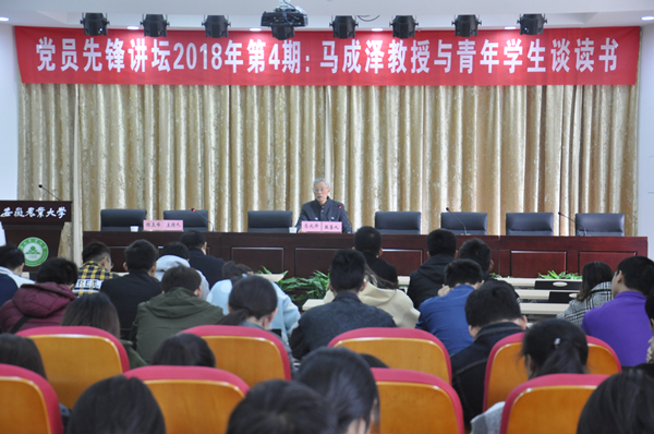 本网讯 为进一步创新大学生思想政治教育形式,扎实推进特色党建品牌“对话青春信仰”之“每日阅读”活动,11月21日下午,资源与环境学院邀请退休党员教师马成泽教授做客“党员先锋讲坛”,与青年学生畅谈读书。学院学生党员、入党积极分子和主要学生干部参加报告会,会议由学院办公室主任程玉峰主持。