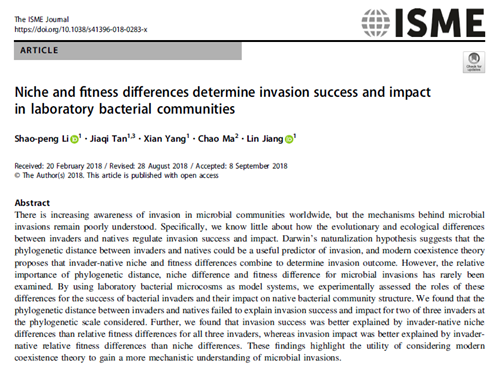 本网讯 9月25日,《ISME Journal》(5年平均影响因子11.663)在线发表了安徽农业大学农田生态保育与污染防控安徽省重点实验室、佐治亚理工学院等单位合作研究成果,论文题目为《Niche and fitness differences determine invasion success and impact in laboratory bacterial communities》。佐治亚理工学院黎绍鹏、谈家祺为共同第一作者,我校马超博士和佐治亚理工学院蒋林教授为共同通讯作者。