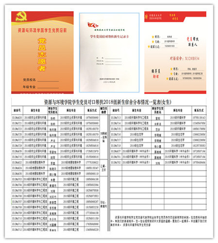 典型引路是资源与环境学院在大学生思想政治教育和成长成才教育中一直坚守和传承的一项重要工作。今年是学院党员志愿者迎新工作连续开展的第10年,也是党员“1+1”结对帮扶新生宿舍开展的第8年,同时是学院推出毕业生“党员青春成长记忆”的第5年,为继续把典型引路这项工作做好、做细、做出成效,在2018级新生报到和入学教育期间,学院全体学生党员佩戴“党员志愿者”工作证、设立党员迎新服务站等贴心为新生服务;向每位新同学赠送《对话青春信仰—2017届毕业生党员青春成长记忆》一书作为入学教育教材;安排高年级优秀学生党员担任辅导员助理,组织党员“1+1”结对帮扶新生宿舍等,发挥学生党员在广大新同学中的典型引路积极作用,帮助新生尽快适应大学生活,为新同学在入学之初树立榜样,引导新生见贤思齐,确立大学奋斗目标,同时把入党教育关口前移,在2018级新生以及家长中引起了强烈反响。