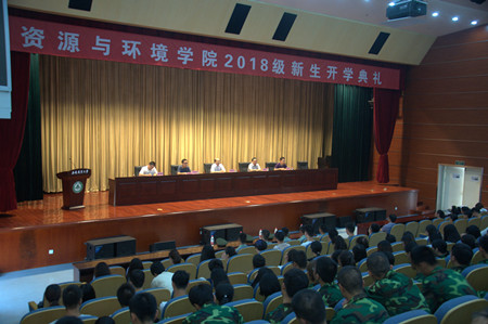 本网讯:9月4日上午,资源与环境学院2018级新生开学典礼在图书馆第一报告厅隆重举行。学院党政领导,军训教官,新生辅导员以及全体2018级本科生、研究生参加了会议,会议由学院党委副书记张晓伟主持。