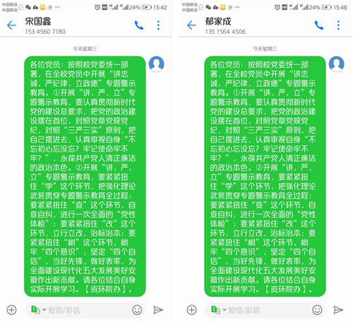 本网讯 按照校党委统一部署和学院工作安排,结合退休教职工身体和生活实际,7月18日,资源与环境学院退休教工支部通过短信平台等方式将“讲忠诚、严纪律、立正德”专题警示教育总体要求、内容和关键环节传达到每位退休教职工党员,并布置相关自学内容和要求。(宫志锋 通讯员:程玉峰)