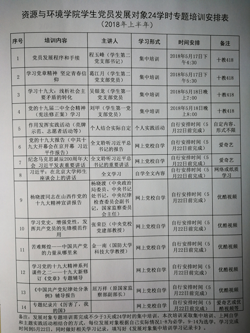 学院严格按照《中国共产党发展党员工作细则》和教育部党组印发的《普通高等学校学生党建工作标准》要求,制定了《资源与环境学院学生党员发展对象24个学时专题培训安排表》,培训采取集中培训、网上党校自学、主题实践和收看网络视频相结合方式开展,集中培训以学生党支部书记和学生党员讲师团成员为主,重点开展入党程序和手续,学习党章和党的十九大精神、坚定青春信仰等;网上党校学习以收看习近平总书记在中共十九大报告、纪念马克思诞辰200周年纪念大会重要讲话、全文学习总书记在北京大学师生座谈会上的重要讲话,以及中央政治局委员、中央书记处书记、中央纪律检查委员会副书记、国家监察委员会主任杨晓渡关于学习宣传贯彻党的十九大精神宣讲报告,中央党校教授张荣臣和国防科技大学教授金一南等网络党课视频为主,培训内容涉及党的十九大精神、党章党史党规和专题记录片《厉害了,我的国》等。