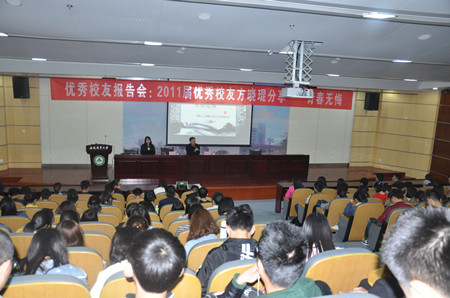 本网讯 4月14日下午,资源与环境学院在图书馆第二报告厅举行优秀校友报告会,邀请学院2011届环境工程专业优秀校友、合肥市统计局方晓琨作报告交流。学院200名同学参加报告会,报告会由学院办公室主任程玉峰老师主持。