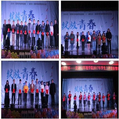 学院党委书记刘凯致辞,他说,党的十九大把生态文明定位为千年大计,作为资环学子,以后大有可为,也必将大有作为。希望大家树立专业自信,以美丽中国建设为己任,在资环学院这个大家庭里成长成才,努力为中华民族伟大复兴作出自己的贡献。在热烈的掌声和欢快的音乐中,颁奖嘉宾先后为学院2017年教学竞赛获奖教师,以及国家奖学金、国家励志奖学金、专业奖学金的学生代表、暑期“三下乡”社会实践优秀团队、志愿服务先进个人、优秀运动员代表、优秀班集体、先进团支部等获奖代表颁奖。