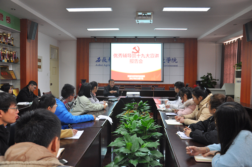 本网讯 为进一步深入推进十九大精神学习进学生组织和班级,12月7日中午,根据学院学习宣传贯彻党的十九大精神安排和部署,安徽省优秀辅导员程玉峰老师为学院各班级团支部书记作党的十九大精神专题宣讲报告。