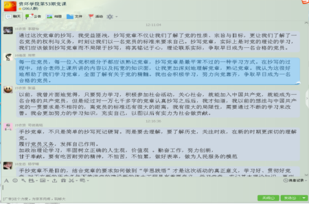 2015级环境科学专业的闫传群在交流中谈到:抄写党章不仅是简单的“抄”,更是用心去“学”,通过“抄”来加深对党章的理解。俗话说“好记性不如烂笔头”,一遍认真的抄写会加深人的记忆。只有用心去抄、去体会,才不会辜负倡导者的初衷,也是对一个人耐心和韧性的考验。自己在抄写过程中会不时停下笔来对照党章要求比照自己的行为,时刻激励自己朝一名合格党员、优秀党员的方向努力。