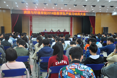 本网讯 4月28日上午,资源与环境学院在欣苑四楼学生活动中心召开2014级教学生产实习动员会。教务处处长李绍稳、学院党政领导郜红建、张晓伟、吴祥为出席会议,各专业负责人、教研室主任、实习队长、学院督导组老师以及2014级本科260余名实习生参加动员会,会议由学院党委副书记张晓伟主持。