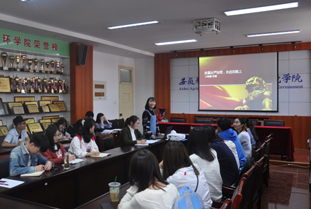 本网讯 4月27日下午,资源与环境学院学生第一党支部按照“一月一主题”的学习讨论安排,结合“学生党员讲师团”工作统筹部署,来自2013级地理信息科学专业的洪冰倩和任谦两位同学党员为支部党员作专题辅导报告。学习讨论会由学生第一党支部书记朱晓晨主持。