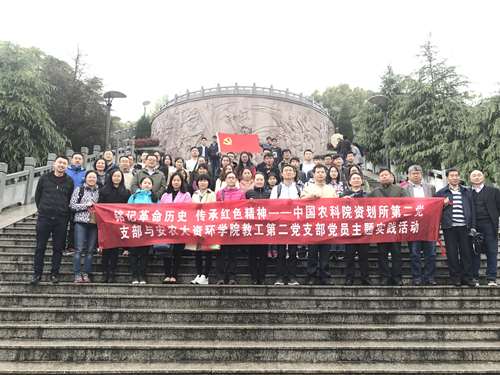 4月9日上午,资环学院教工第二党支部与中国农业科学院资划所第二党支部党员集中乘车前往金寨开展“铭记革命历史,传承红色精神”主题实践活动。在红军革命烈士纪念塔前,聆听了金寨的红色历史,向革命烈士敬献了花篮,重温了入党誓词。大家在讲解员的带领下,瞻仰了红军纪念堂、洪学智将军墓碑和红军墓园,参观了革命历史博物馆。下午,党员们在资环学院党委书记刘凯的陪同下,参观了我校大别山综合试验站,考察了生理生态、土壤农化和农产品质量安全检测实验室。金寨县副县长、大别山试验站站长何金铃向大家介绍了我校“一站一盟一中心”的产学研合作模式和“1+1+N”的新型农业科技推广服务模式。