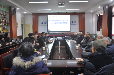 会上,学院党委书记刘凯代表学院对广大退休教职工和党外人士表示新年的慰问,感谢他们为学院的发展作出的贡献。他通报了学院“两学一做”学习教育开展和专题民主生活会准备情况,重点介绍了2016年学校重点工作和事业发展情况。他说,学校和学院事业蒸蒸日上是一代又一代农大人传承接力的结果,是全体教职工团结奋进的结果,希望老前辈们和党外人士一如既往地关心和支持学校学院发展,并多提宝贵意见。