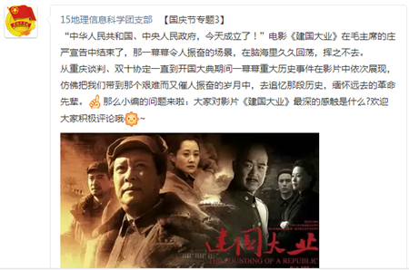 为切实增强活动效果,在院团委统一组织下,各团支部结合线下实践,积极开展线上宣传、互动。10月1日至7日,学生分会团支部发起了“红色的记忆永恒的精神”——线上展示活动,结合前期观看红色影片、开展主题演讲等活动,引导资环学子树立正确的人生观、世界观、价值观,培养主人翁精神。各班级团支部纷纷就前期开展的活动发起线上主题讨论、互动交流。同学们纷纷表示,此次主题团日形式新颖,活动内容贴近生活,实效明显。(刘怡青 通讯员:程玉峰)