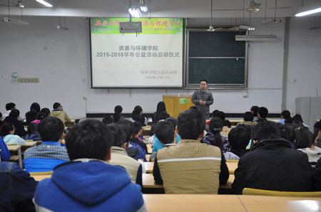 11月11日下午,资源与环境学院2015—2016学年公益活动启动仪式在9教227教室举行。学院党委副书记张晓伟出席仪式,学院团委老师、校岗部学生干部及全体国助生参加了仪式。