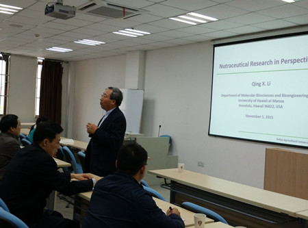 11月1日下午,美国夏威夷大学李庆孝来校进行学术交流和工作,并作了《营养品研究前景》的学术报告。报告会由资环学院院长郜红建主持。
