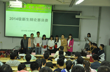 本网讯:10月22日晚,资源与环境学院新生辩论赛决赛在九教327教室举行并取得圆满成功,学院团委老师和2014级新生班主任到场观看比赛并为获胜代表队颁奖。