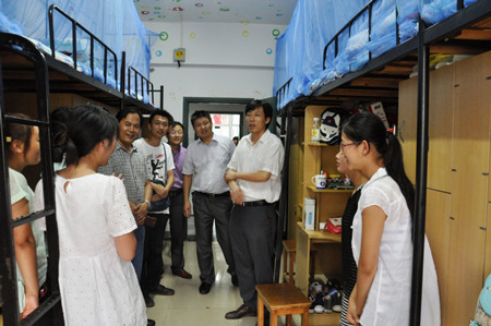 5日下午,学院党政领导带领新生辅导员深入学生宿舍,看望慰问新生。每到一间宿舍,领导们都细致地了解学生的籍贯和所学专业,亲切地询问他们“是不是习惯?”、“有没有困难?”,并仔细叮嘱新同学要注意饮食卫生、注意安全、防火防盗,尽早与大家熟悉起来,尽快转变角色适应大学生活等。看到有的宿舍新同学刚来就把宿舍卫生整理地很干净、环境布置地很整齐和同学关系相处地很融洽,学院领导很高兴,及时地给予肯定,并勉励大家再接再厉,生活上要学会相互包容和关心。对同学们关心的问题和提出的一些建议和意见,学院领导耐心进行解答。