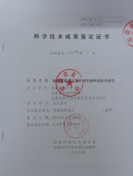 会上,鉴定委员会专家认真听取了课题组有关项目实施和成果总结的汇报,审阅了相关鉴定材料。专家一致认为该项科技成果解决了皖西高寒山区西洋参林下种植的关键技术难题,经济效益、社会效益和生态效益显著。创新提出的西洋参林下种植窄畦育苗技术和壮苗带生物菌肥落地技术达到国内领先水平。