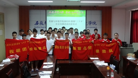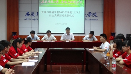 7月4日下午,资源与环境学院在十教418室举行2013年暑期“三下乡” 社会实践活动出征仪式。学院党委副书记陈先玉出席并作讲话,院团委老师、各实践团队带队老师及指导老师、五支实践团队成员参加了仪式。