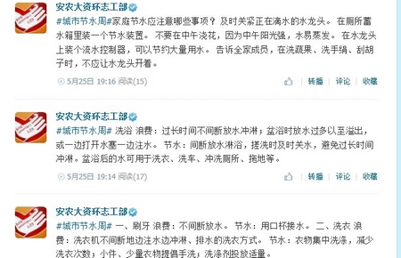 为迎接全国第22个城市节水宣传周,积极构建节水型校园,资源与环境学院青年志愿者工作部在校总务处的指导下自5月13日-5月25日开展了为期两周的节水周宣传活动。