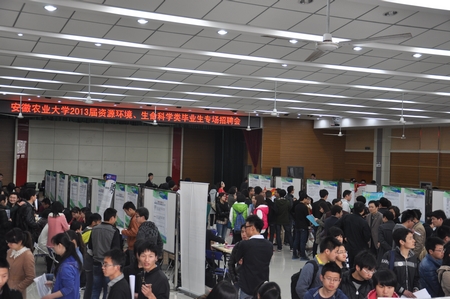 本次招聘会得到了两个学院领导的高度重视以及广大毕业生的积极参与,共吸引了中化集团安徽分公司、徽商农家福公司、美国世多乐、上海量健生物科技、伊利乳业等55家企业前来招聘,提供就业岗位近千个,涉及环境工程、环境科学、生态学、农业资源与环境、生物科学、生物技术等专业。会场气氛热烈,人头攒动。各招聘单位通过张贴海报、发放公司宣传单页、播放短片等形式吸引毕业生前来洽谈。应聘毕业生们手持自己精心准备好的个人简历,积极与招聘人员交流,认真了解用人单位的概况、聘任意向、用人标准、薪资待遇及发展空间。部分低年级的学生也自发前来参加了招聘活动,提前感受就业市场,为今后就业积累经验。