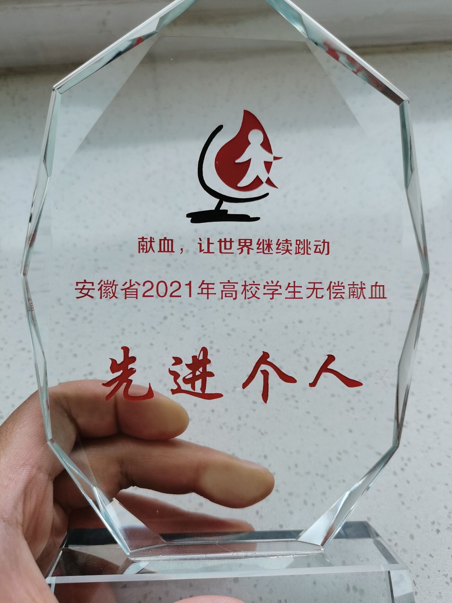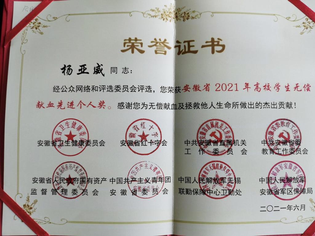 活动颁发了全国无偿献血先进市奖、全国无偿献血奉献奖、无偿捐献造血干细胞奖、无偿捐献促进奖,现场揭晓了安徽省2021年度献血公益之星、高校学生先进个人、无偿献血先进集体等奖项。对合肥市8位百次献血者和4位两百次献血者颁发了奖杯。我院2020级农药学专业(学硕)杨亚威同学荣获“安徽省2021年高校学生无偿献血先进个人”称号。