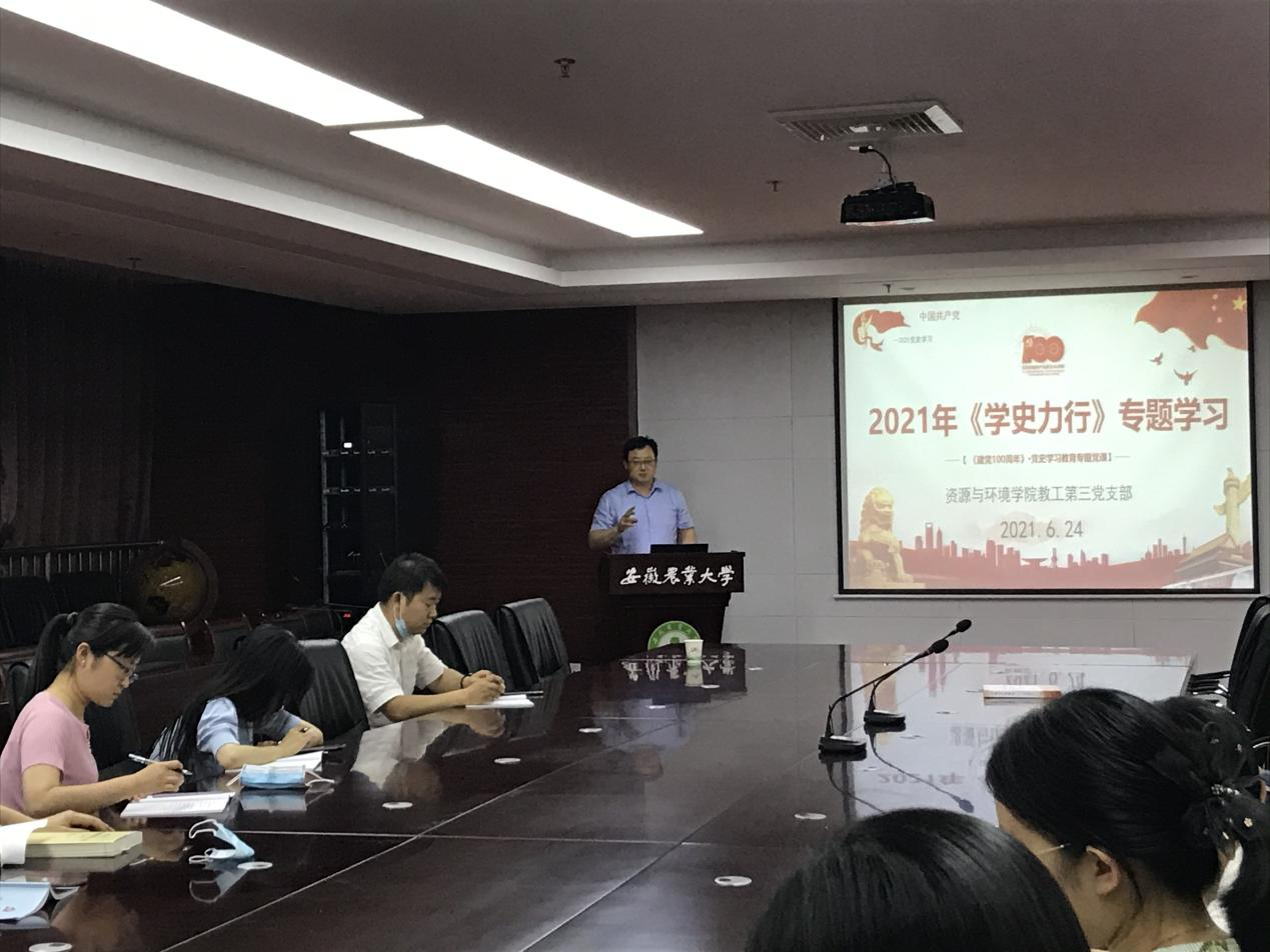 本网讯 6月24日下午,资源与环境学院教工第三党支部在中西部综合楼510会议室开展“学史力行”专题学习研讨与主题党日活动。支部全体党员参加,活动由支部副书记吴红淼主持。