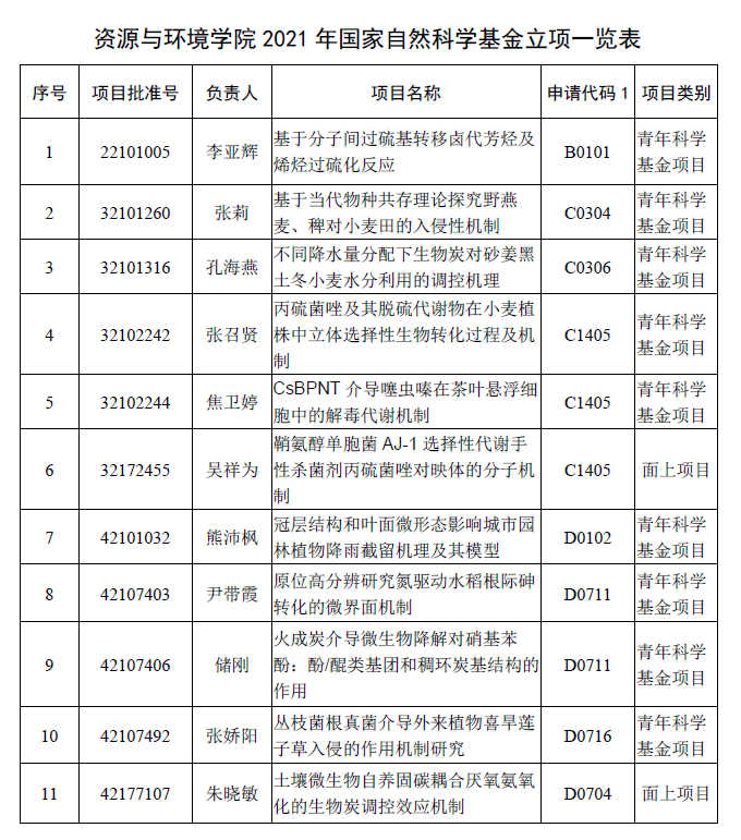 本网讯 8月18日,国家自然科学基金委公布了2021年度国家自然科学基金项目评审结果,资源与环境学院共有11个项目获得立项资助,其中面上项目2项,青年基金9项,资助率达23.9%。