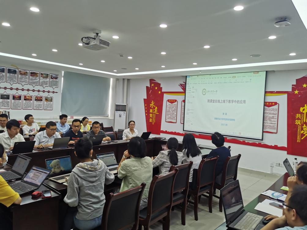 环境工程专业负责人樊霆副教授以《雨课堂在线上线下课堂教学中的应用》为题结合承担课程进行了讲解和指导,详尽分析了传统教学理念与新时代教学理念的差别,阐释了在移动互联网时代背景下课堂教学的改革路径与实施方法,结合承担课程深入浅出地讲述了基于雨课堂工具建设线上线下混合式教学的方法。