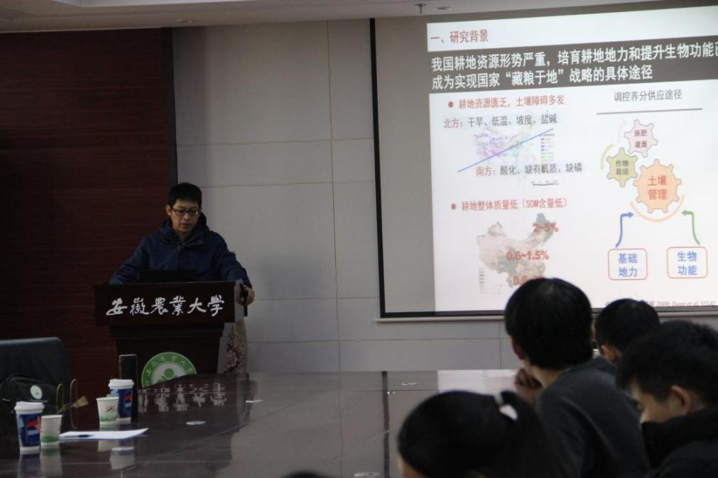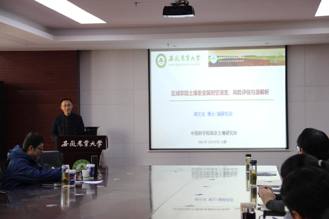 本网讯 12月07日上午,中国科学院南京土壤研究所蒋瑀霁研究员和胡文友副研究员应安徽农业大学资源与环境学院邀请进行学术交流与指导,并在中西部综合楼510会议室分别作了题为“红壤团聚体碳氮磷转化的生物学过程:线虫—微生物互作机制”和“区域农田土壤重金属时空演变、风险评估与源解析”的学术报告。会议由叶新新副院长主持,我院师生参加了报告会。